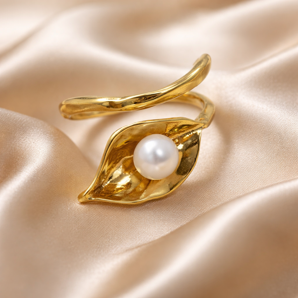 טבעת זהב 14 קארט פרח קאלה עם פנינה