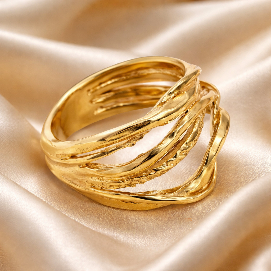 רצועות זהב מפותלות בקווים מעוגלים שיוצאים מטבעת צרה אחת