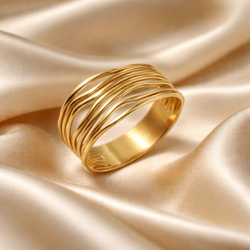 הטבעת מציגה שבעה קווים דקים ועדינים המתאחדים ללהקה הרמונית אחת