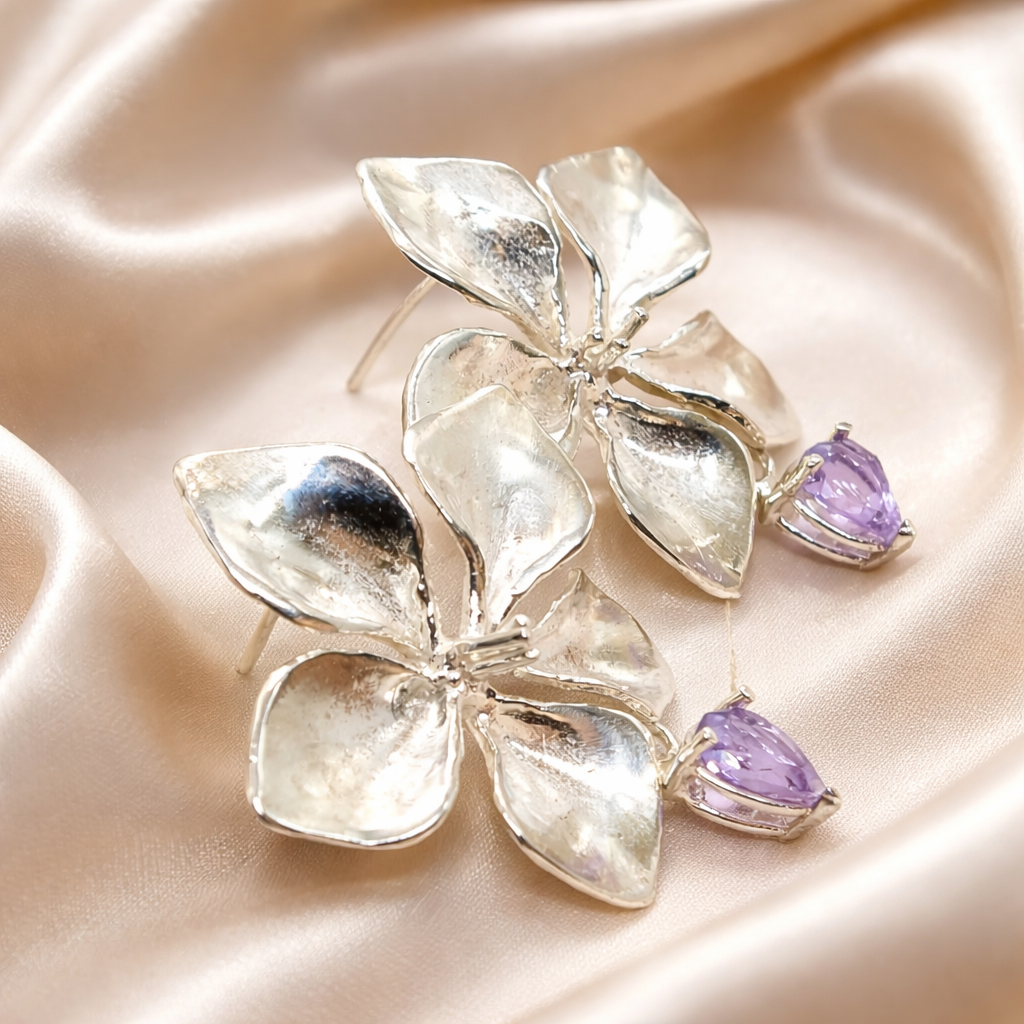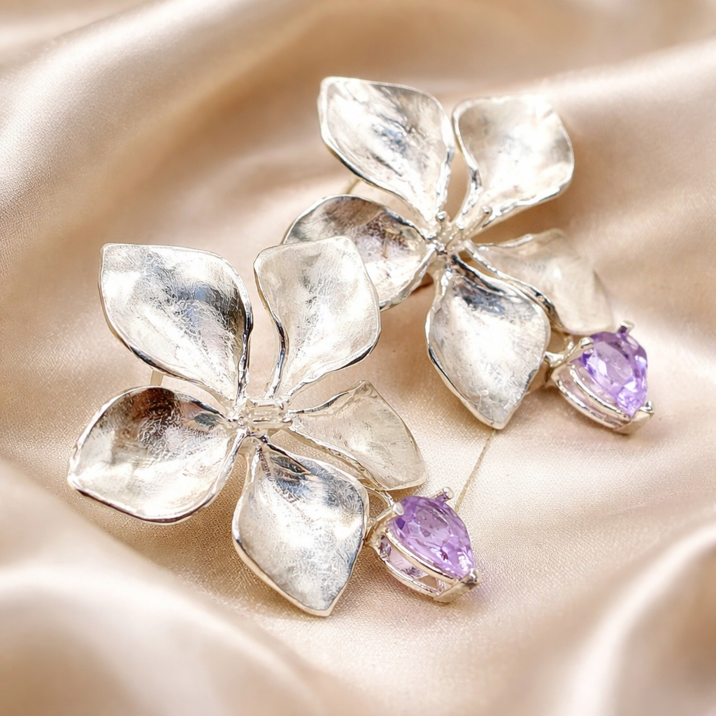 עגיל פרח מפוסל בעבודת יד מכסף