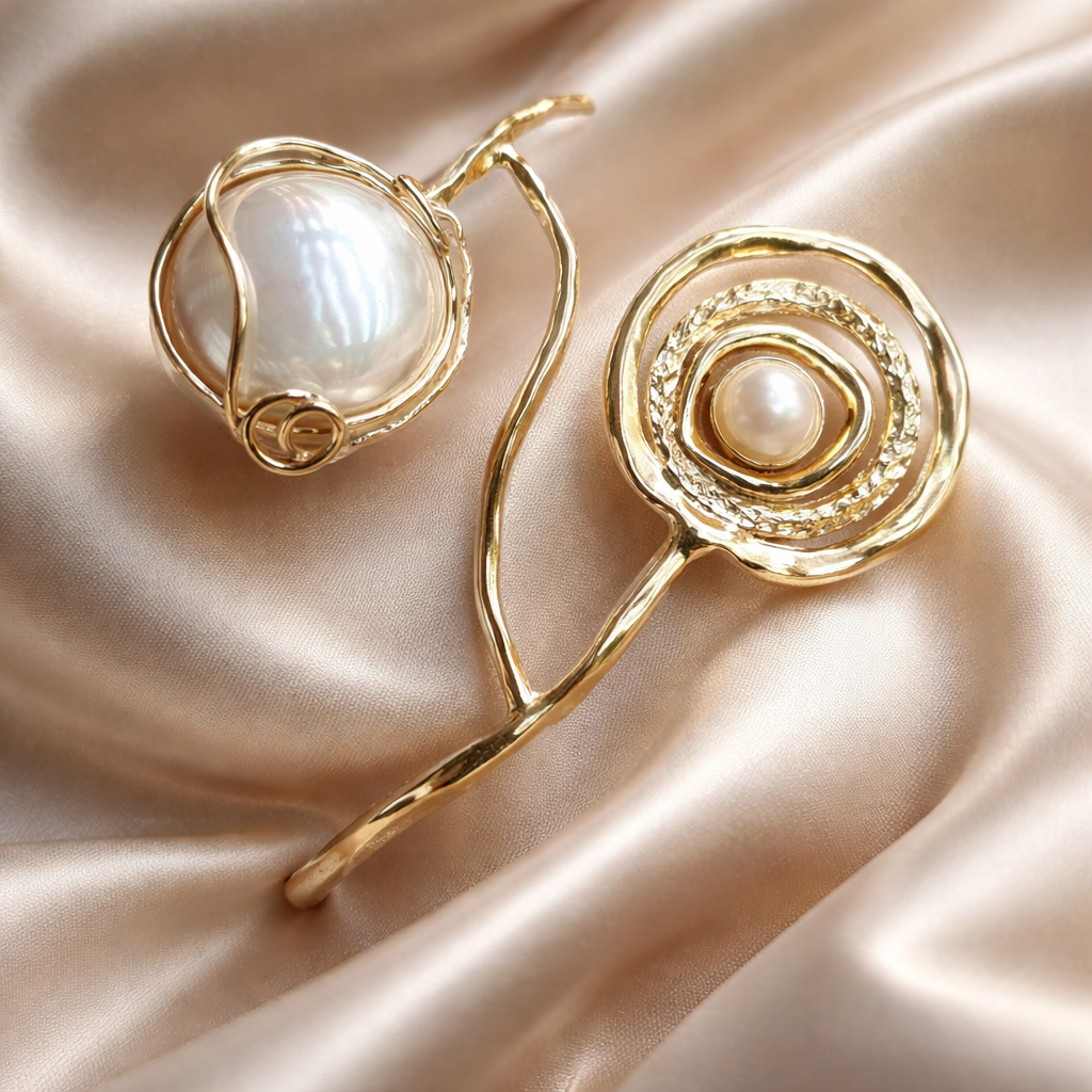 ובקצה השני שלושה חישוקים במרקמים שונים שבאמצע יושבת לה פנינה לבנה מבריקה