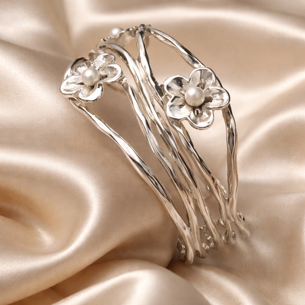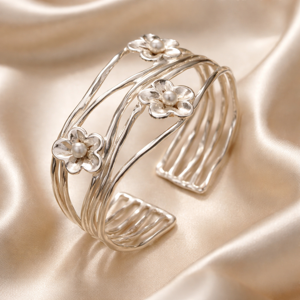 צמיד כסף עם פרחים ופנינים