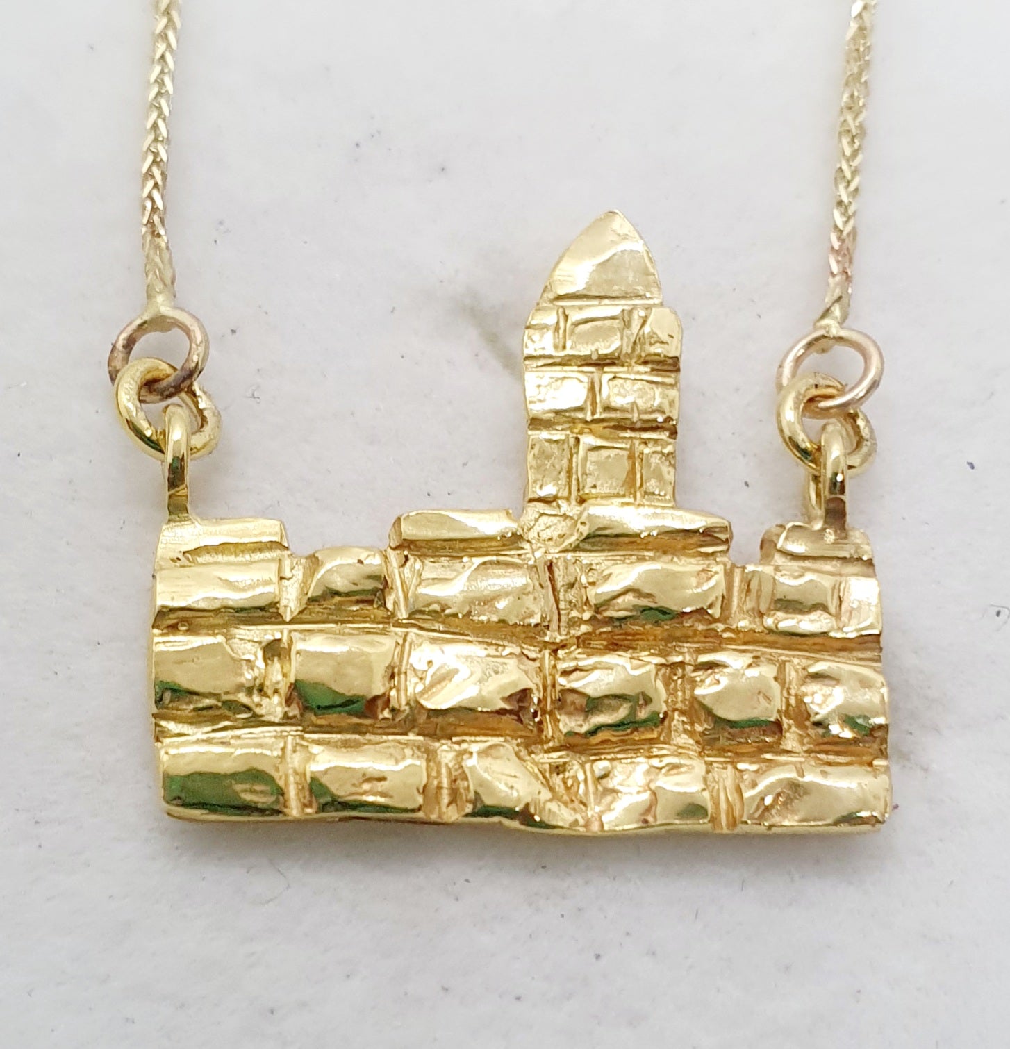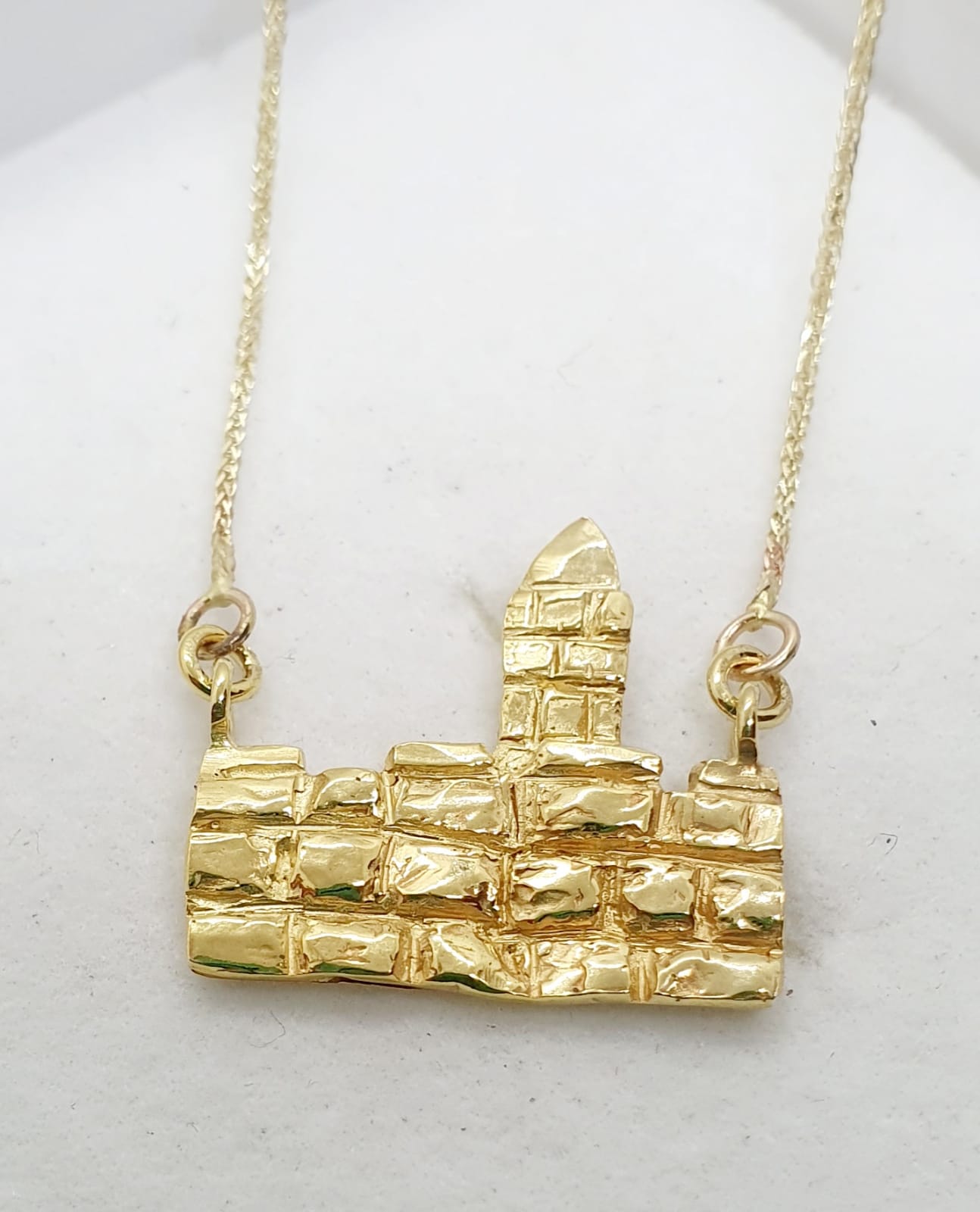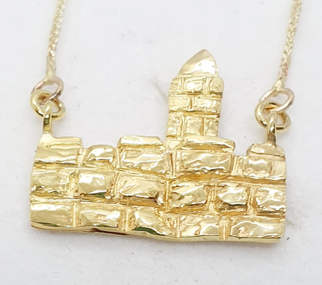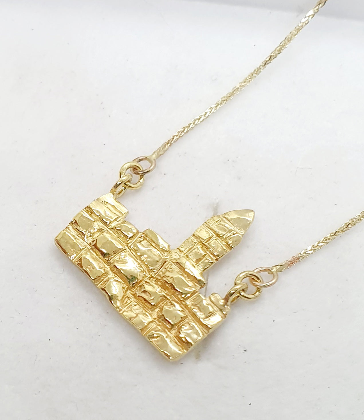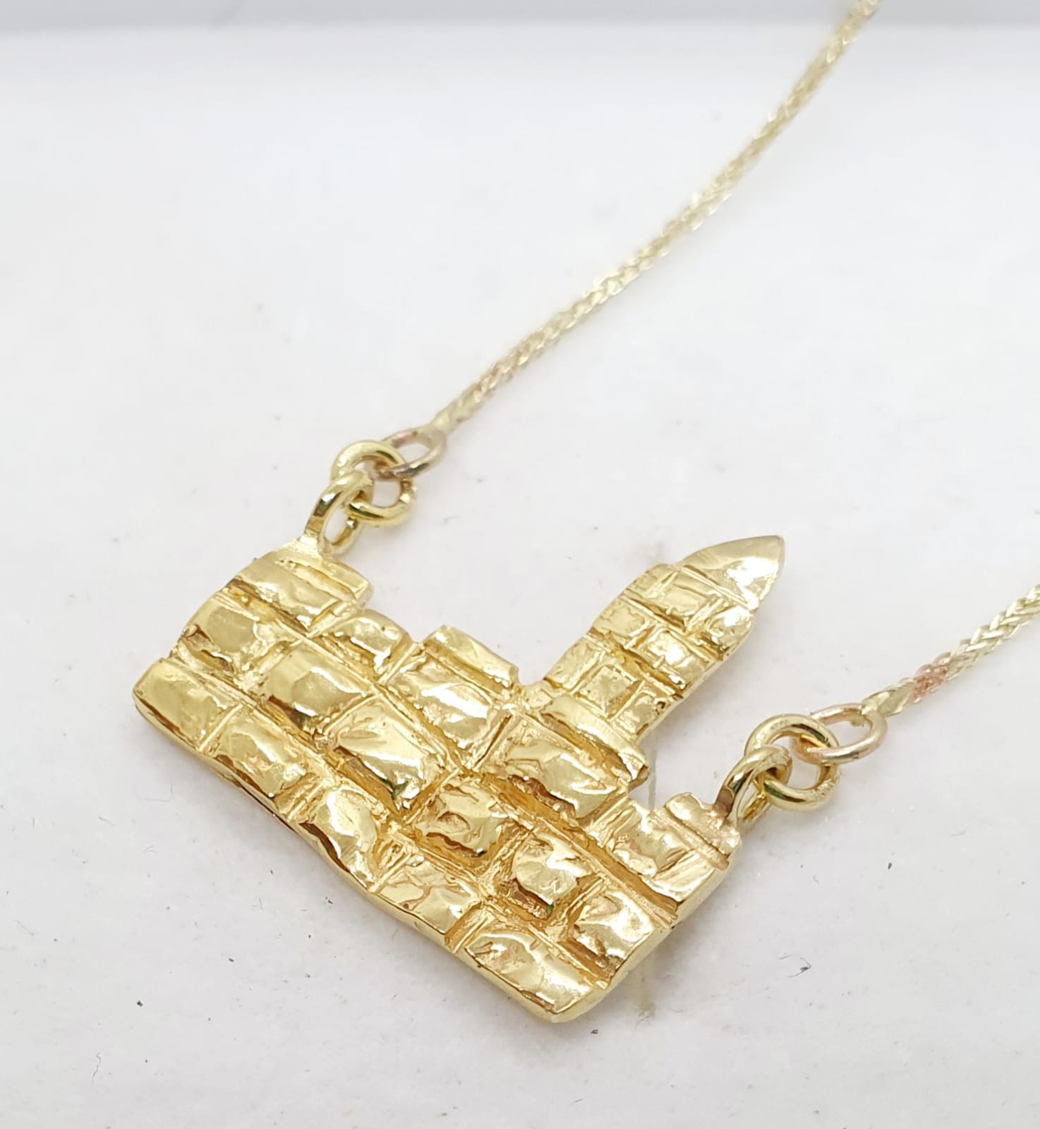 תליון מפוסל מזהב הכותל ומגדל דוד