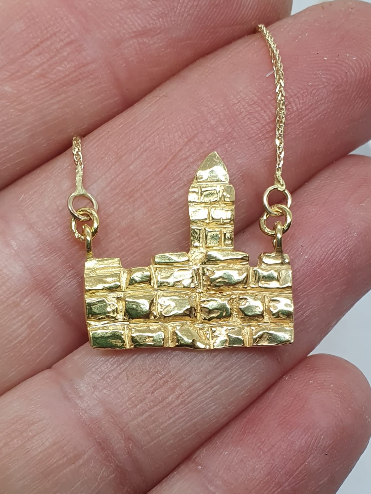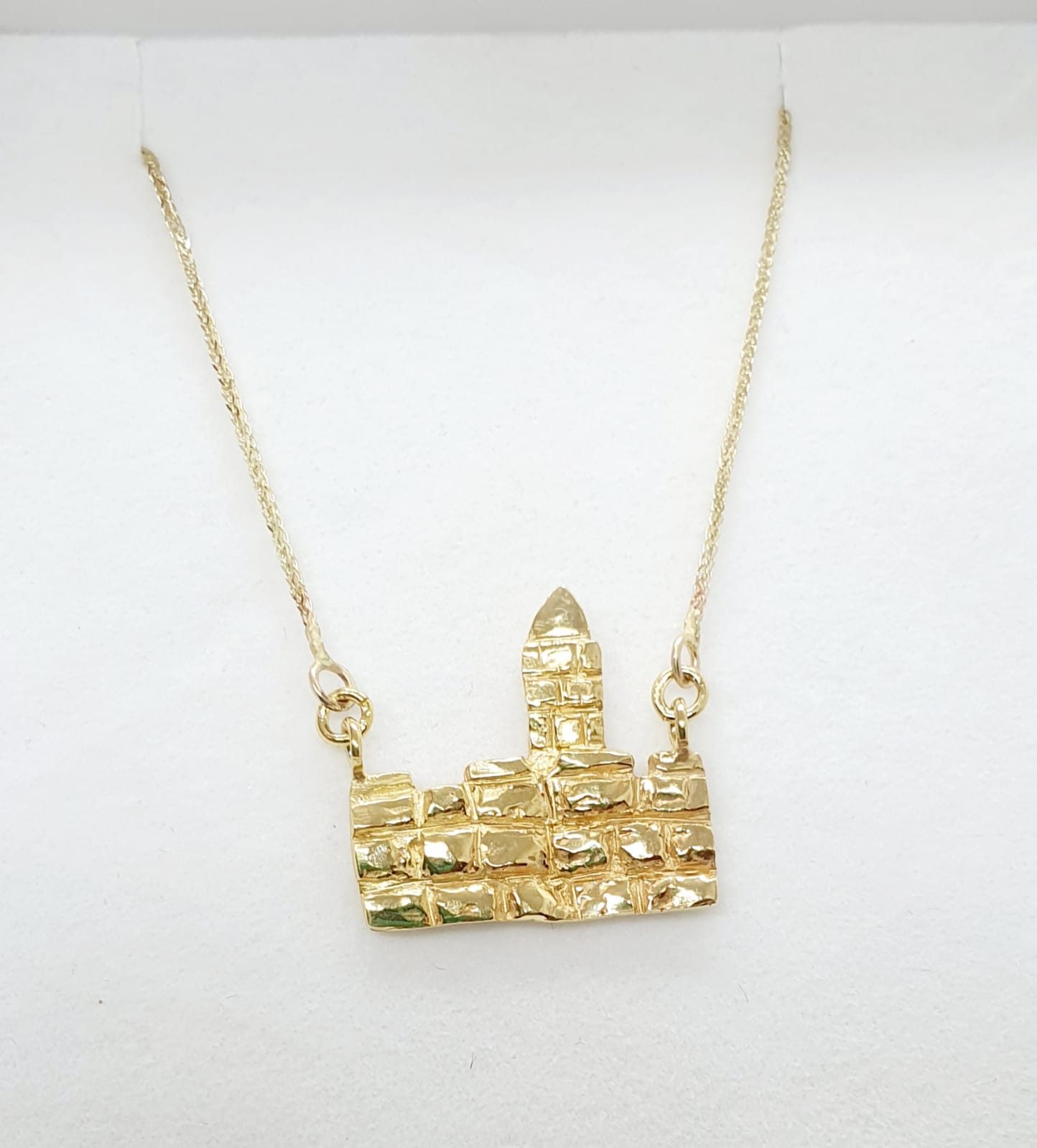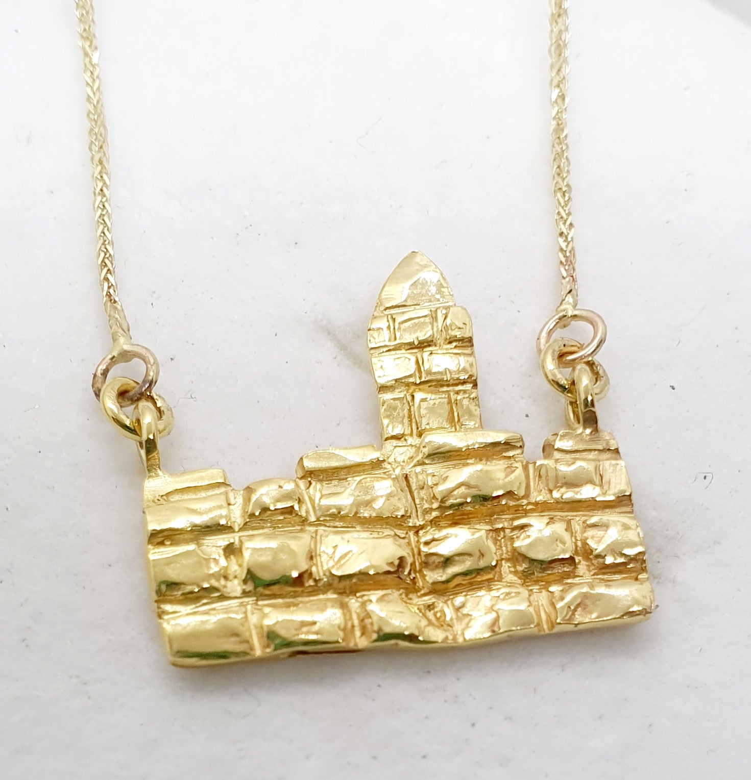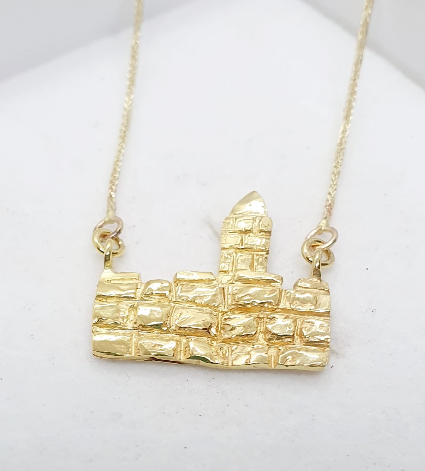 תליון מפוסל מזהב הכותל ומגדל דוד