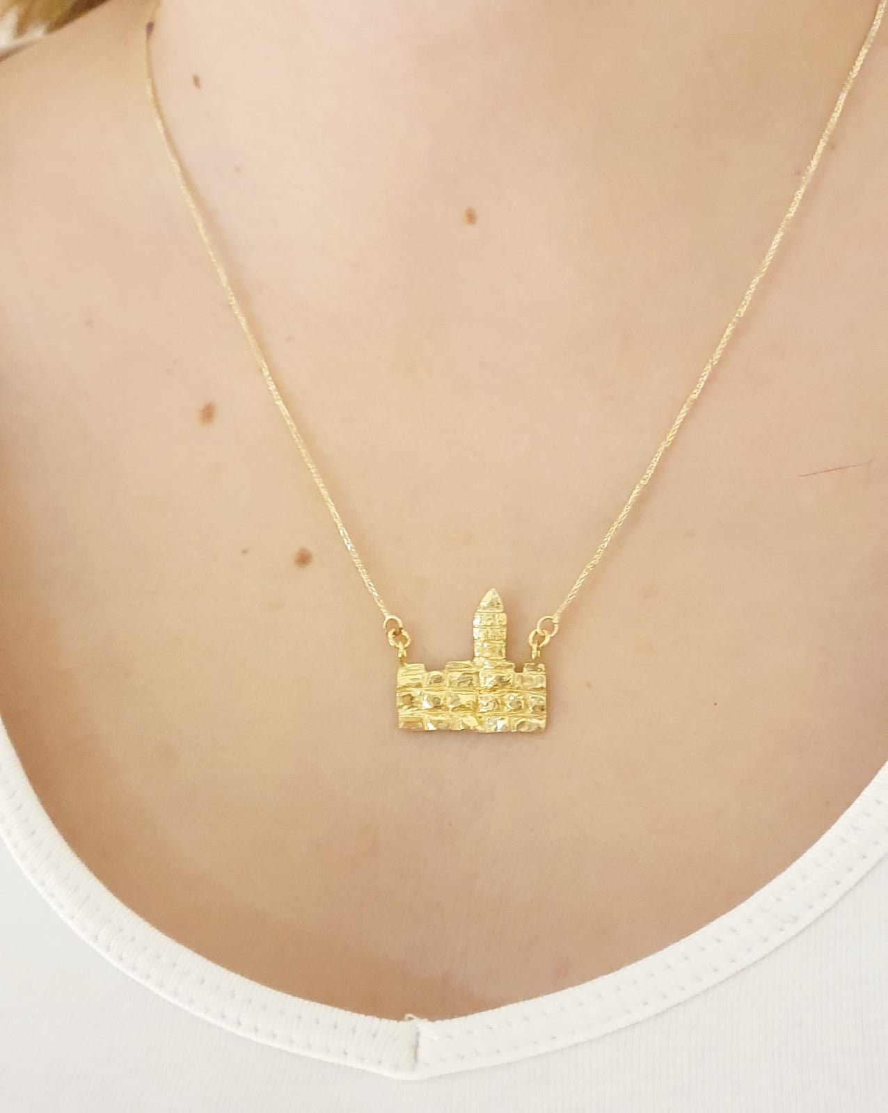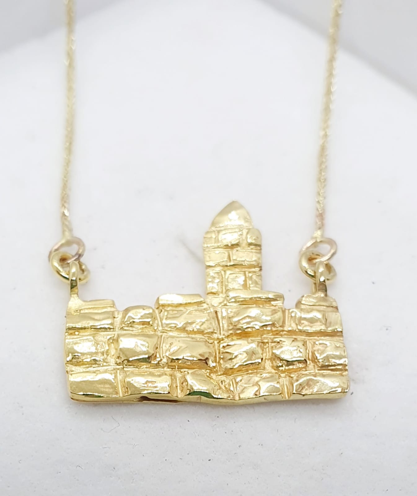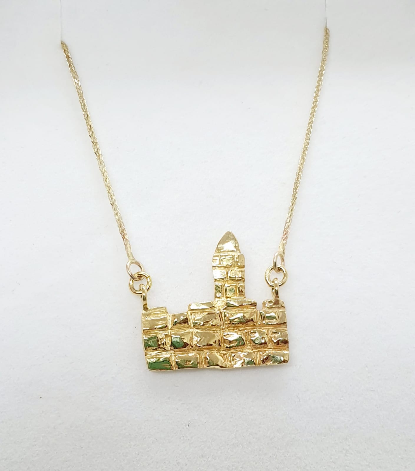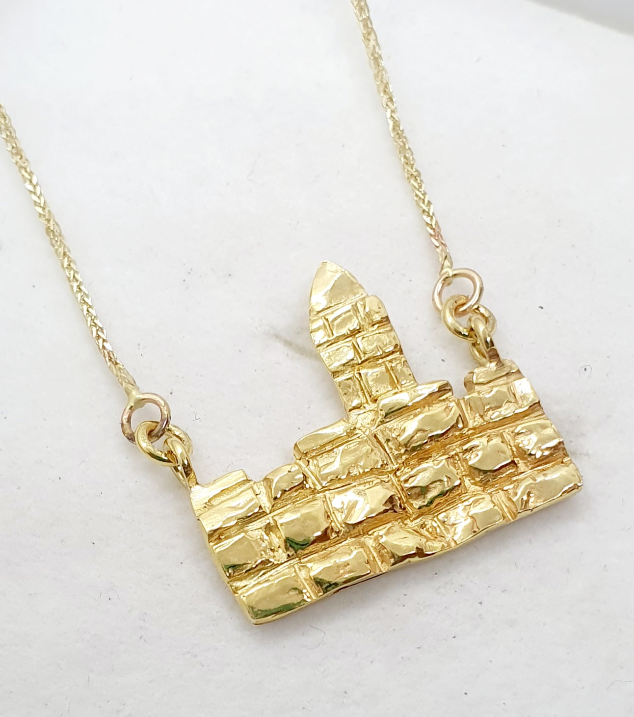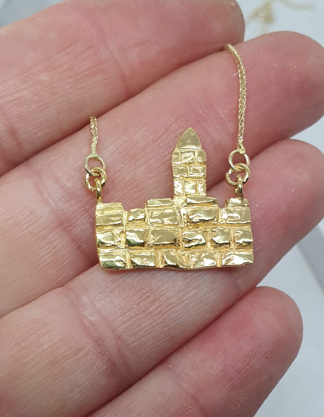 תליון מפוסל מזהב הכותל ומגדל דוד