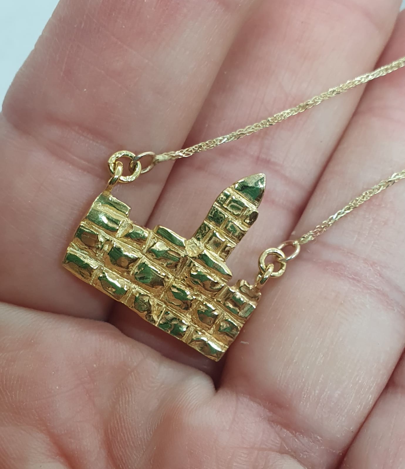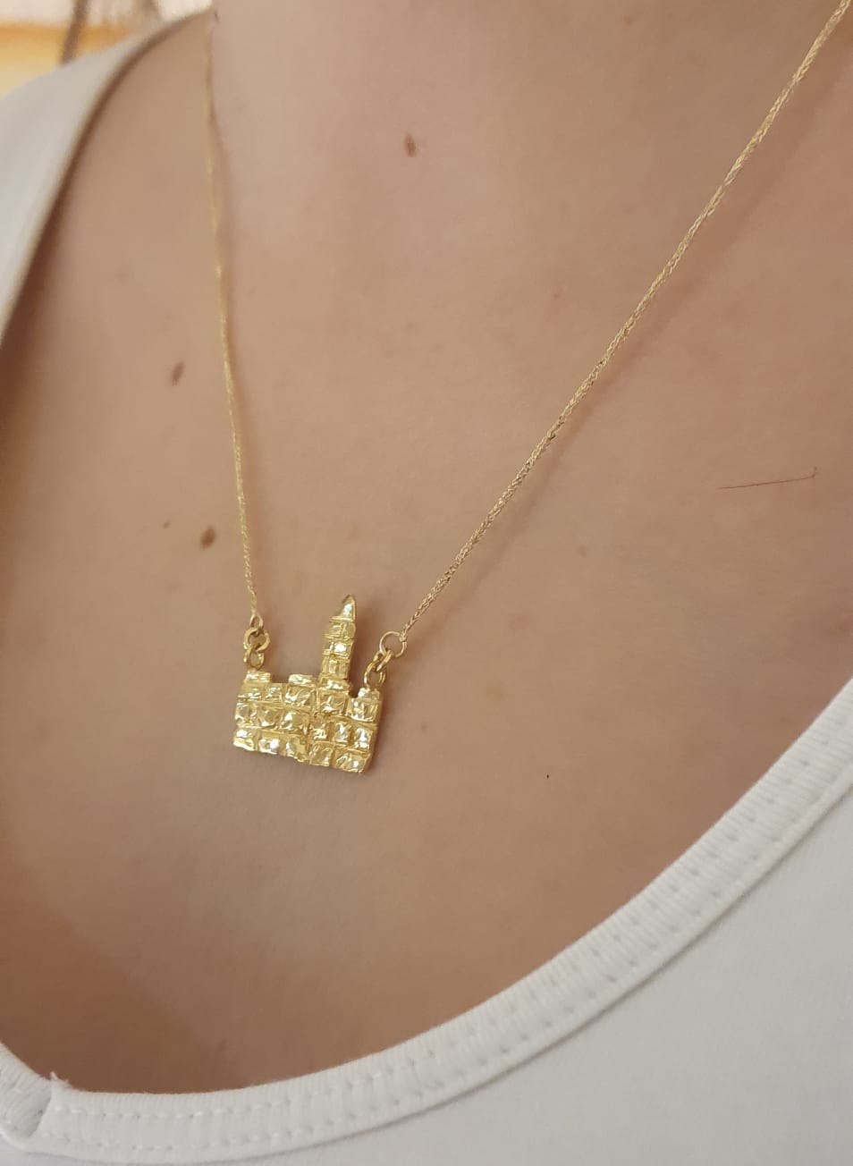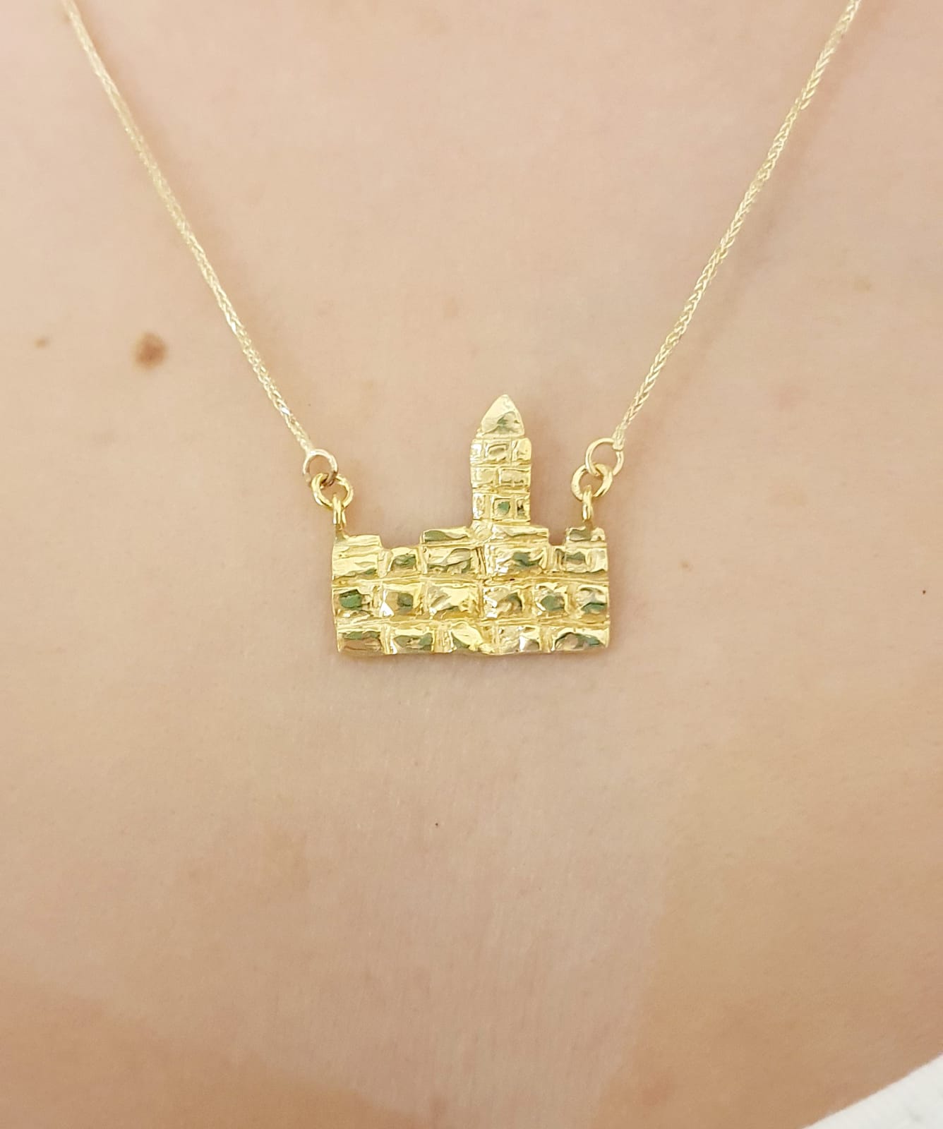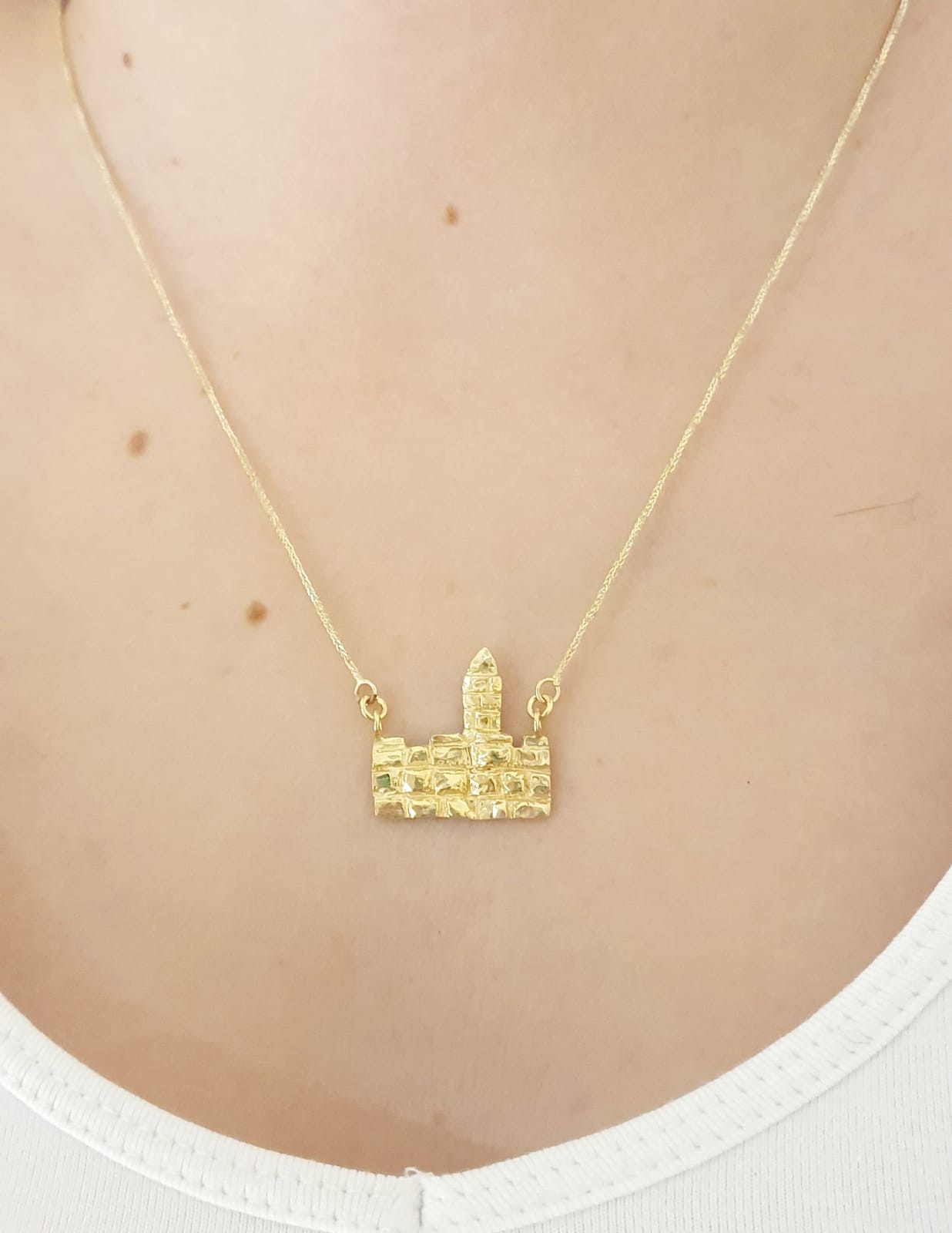תליון מפוסל מזהב הכותל ומגדל דוד